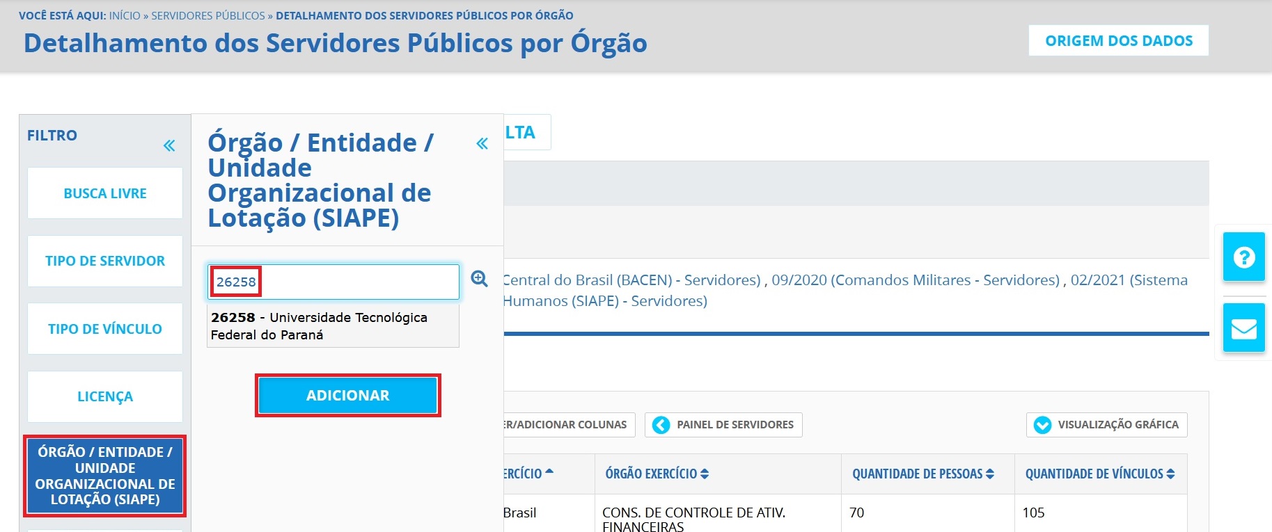 3. Utilizar a barra lateral esquerda de filtros para adicionar um filtro de Órgão/Entidade/Unidade Organizacional de Lotação (SIAPE). Preencher o campo de busca com o código "26258", selecionar a opção disponibilizada e em seguida clicar no botão "Adicionar":