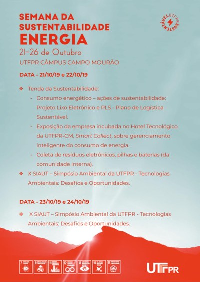 A Semana da Sustentabilidade acontecerá em todos os Câmpus da UTFPR no período de 21 a 26 de outubro, com o tema "energia".