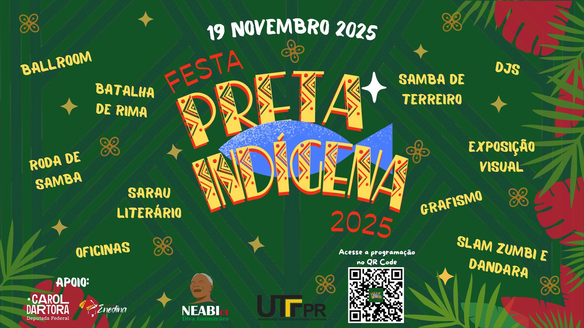 O Núcleo de Estudos Afro-Brasileiros e Indígenas (NEABI) da UTFPR Curitiba , realizará, no dia 19 de novembro, das 9h às 21h, a Festa Preta-Indígena: “ser feliz é a nossa revolução, é aquilombar” - inscreva-se aqui para participar. A iniciativa comemora vitórias, saberes e produções dos povos negros e indígenas, sobretudo de Curitiba e Região Metropolitana.