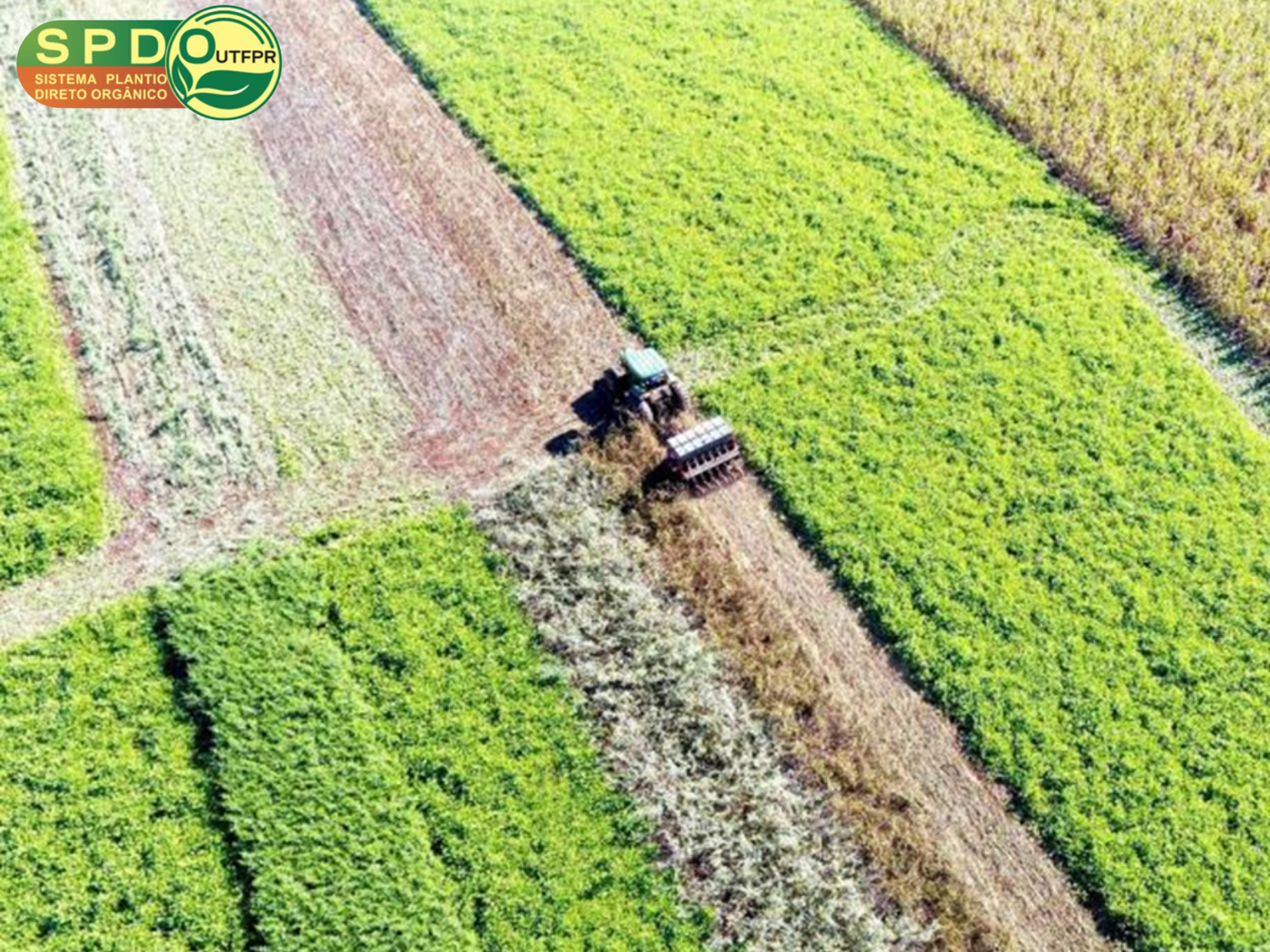 Sistema Plantio Direto Orgânico sobre cobertura de mix de plantas de cobertura recém rolada.
