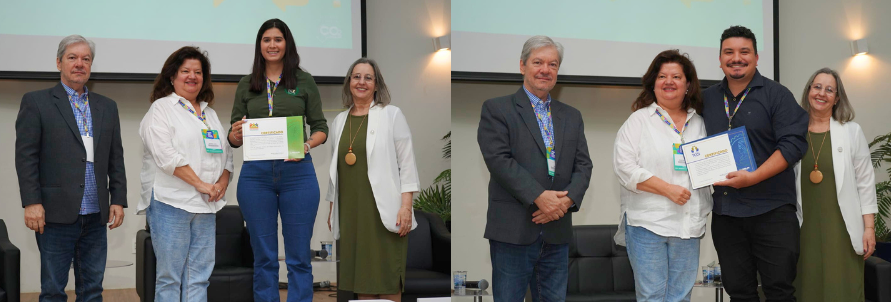 À esquerda, estudante Andreza Silva, representando os participantes do projeto de extensão premiado em primeiro lugar na área de Engenharia Florestal e, à direita, José Agostinho Júnior, vencedor do melhor TCC na categoria de Engenharia Florestal, recebendo a premiação.