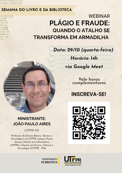 Atividade: 🖋️ Plágio e fraude: quando o atalho se transforma em armadilha Webinar com o Prof. João Paulo Aires (UTFPR Campus Ponta Grossa).