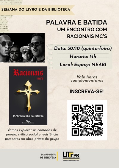 Descrição: Roda de conversa no formato de clube do vinil. Alternando entre a escuta das faixas do álbum "Sobrevivendo no inferno" e a leitura de trechos do livro, exploraremos as camadas de poesia, crítica social e resistência presentes na obra do grupo.