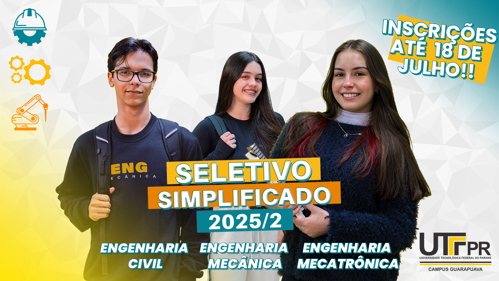As inscrições para o Seletivo Simplificado da UTFPR Guarapuava vão até o dia 18 de julho para o preenchimento de vagas remanescentes e composição de lista de espera para o segundo semestre letivo deste ano. As oportunidades são para os cursos de Engenharia Civil, Engenharia Mecatrônica e Engenharia Mecânica.