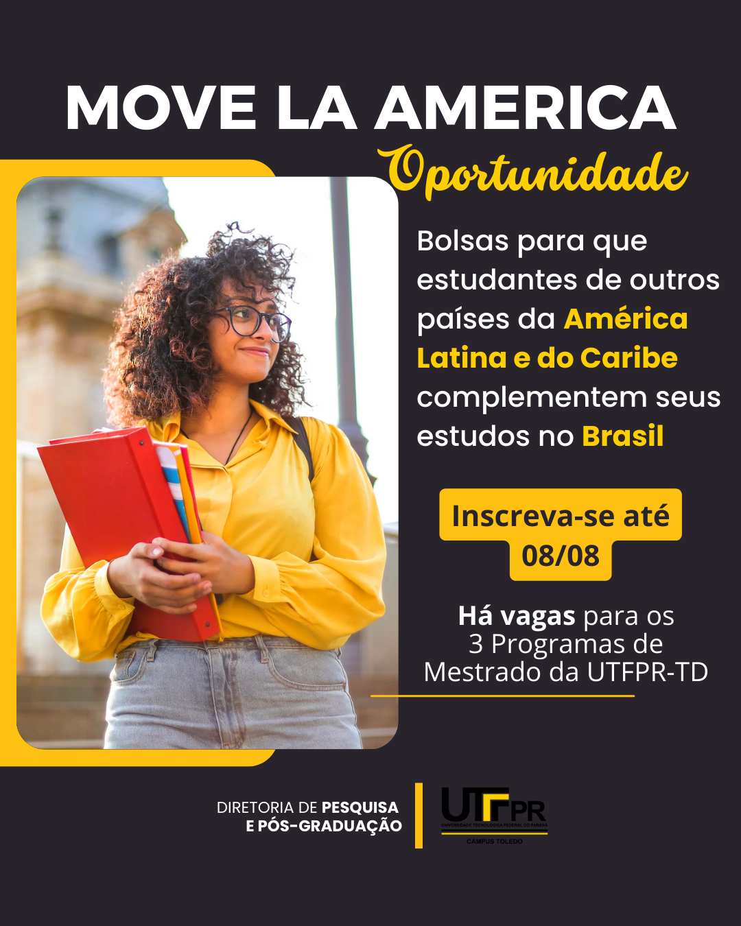 Estão abertas as inscrições de candidatos para a primeira edição do Programa Move La América, que oferta bolsas para que estudantes de outros países da América Latina e do Caribe complementem seus estudos no Brasil. O prazo para apresentação de candidaturas vai até 8 de agosto. O campus Toledo está ofertando 7 vagas para mestrado-sanduíche, distribuídas entre os três Programas de Pós-Graduação: