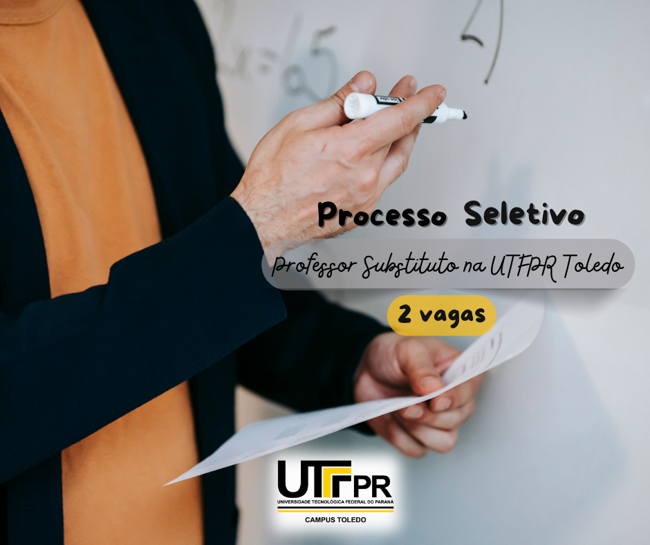 A Universidade Tecnológica Federal do Paraná (UTFPR) informa a abertura de inscrições para o Processo Seletivo EDITAL nº 001/2024-PS-TD, destinado ao preenchimento de duas vagas para a carreira de Professor do Magistério Federal no campus Toledo , que visa contratar professores substitutos conforme especificado nos editais de abertura e condições gerais.
