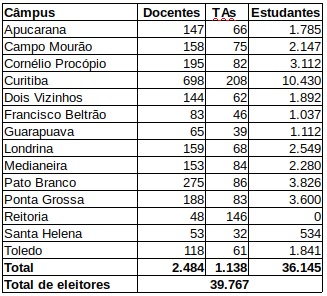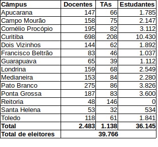 Tabela Geral de Eleitores por câmpus e por categoria - atualizada em 18/06/2020