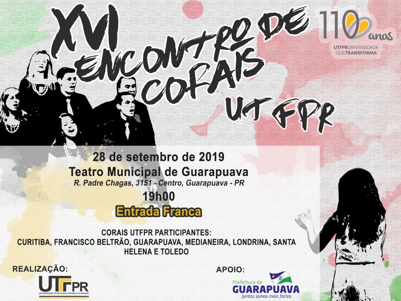 Em comemoração aos 110 anos da UTFPR, realizaremos pela primeira vez em Guarapuava o XVI Encontro de Corais da UTFPR. O evento será dia 28 de setembro às 19h, no Teatro Municipal de Guarapuava . A entrada é franca.
