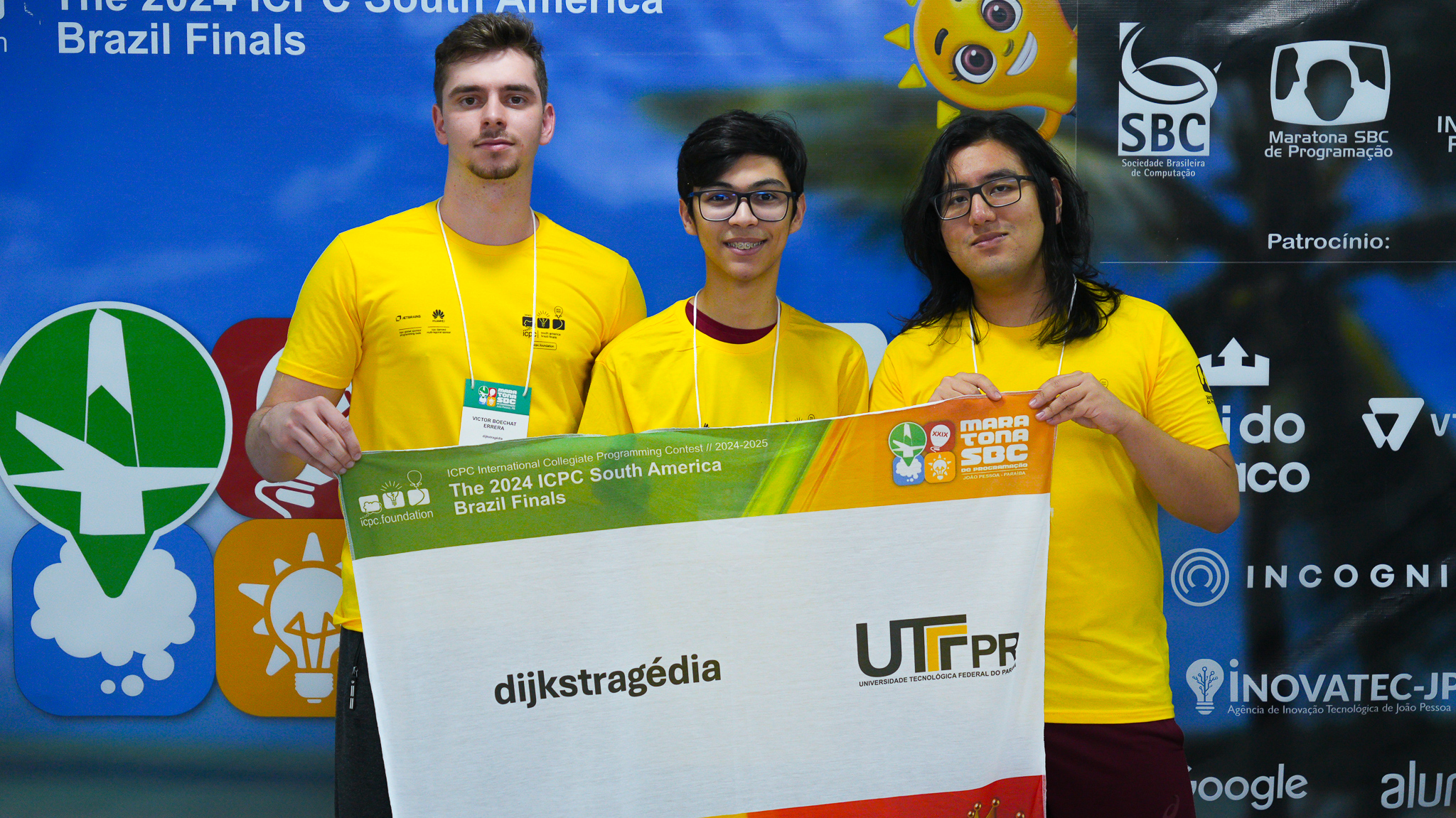 Parabéns a todos e todas que estiveram na Final Brasileira da Maratona de Programação, que ocorreu em João Pessoa no sábado, dia 9 de novembro de 2024. O time dijkstragédia da UTFPR-CT (composto pelos estudantes Thiago Aguiar, Victor Errera, e Alan Tara, todos de Engenharia de Computação) ficou em 1º lugar dentre todos os times paranaenses na competição, tendo ficado à frente inclusive do time da UFPR. O time O Problema do Gerbil Viajante (composto pelas estudantes Thaís Carvalho, Isabela Tulio, ambas de Engenharia de Computação, e pela estudante Maria Fernanda Mota, de Sistemas de Informação) ficou em 2º lugar dentre todos os times femininos na competição. Ambos os times receberam menção honrosa pelo seu excelente desempenho e dedicação. A UTFPR-CT foi mais do que bem representada por esses estudantes. No jantar oficial do evento e cerimônia de premiação e reconhecimento dos times, o time O Problema do Gerbil Viajante foi chamado ao palco para receber o reconhecimento pelo seu desempenho.