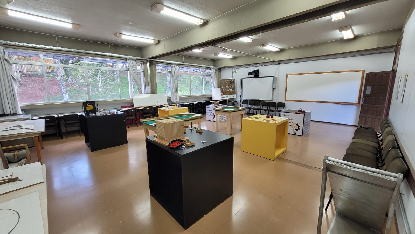 🛠️Equipamentos: Microcomputadores portáteis Dell Inspiron 14, MacBook Pro Apple, tablets iPad Air Wi-Fi de 16 GB, gabinete para recarga de tablets e notebooks, estabilizadores de energia e rack padrão 19”. Dispõe ainda de recursos audiovisuais e multimídia, como projetor interativo LightRaise, document cameras, câmeras IP, câmera GoPro Hero 4 e gravador de voz digital. A infraestrutura inclui armários para equipamentos e livros, armário embutido em madeira, quadro branco cerâmico de grandes dimensões, cadeiras fixas, estofadas, giratórias e ergonômicas, além de mobiliário de apoio às atividades didáticas. O ambiente é climatizado com sistema de ar-condicionado tipo split, piso-teto, e possui conjunto didático para o estudo de sólidos e superfícies de revolução.