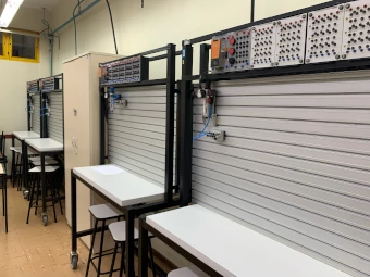 Área de 70m², capacidade para 20 alunos, contando com: 1 Kit de pneumática e hidráulica Festo, 4 bancadas metálicas com rodízio, 1 kit para controle de processos, 1 unidade hidráulica, 1 kit de módulos de controle PID, 1 projetor multimídia e 4 CLP’s. |