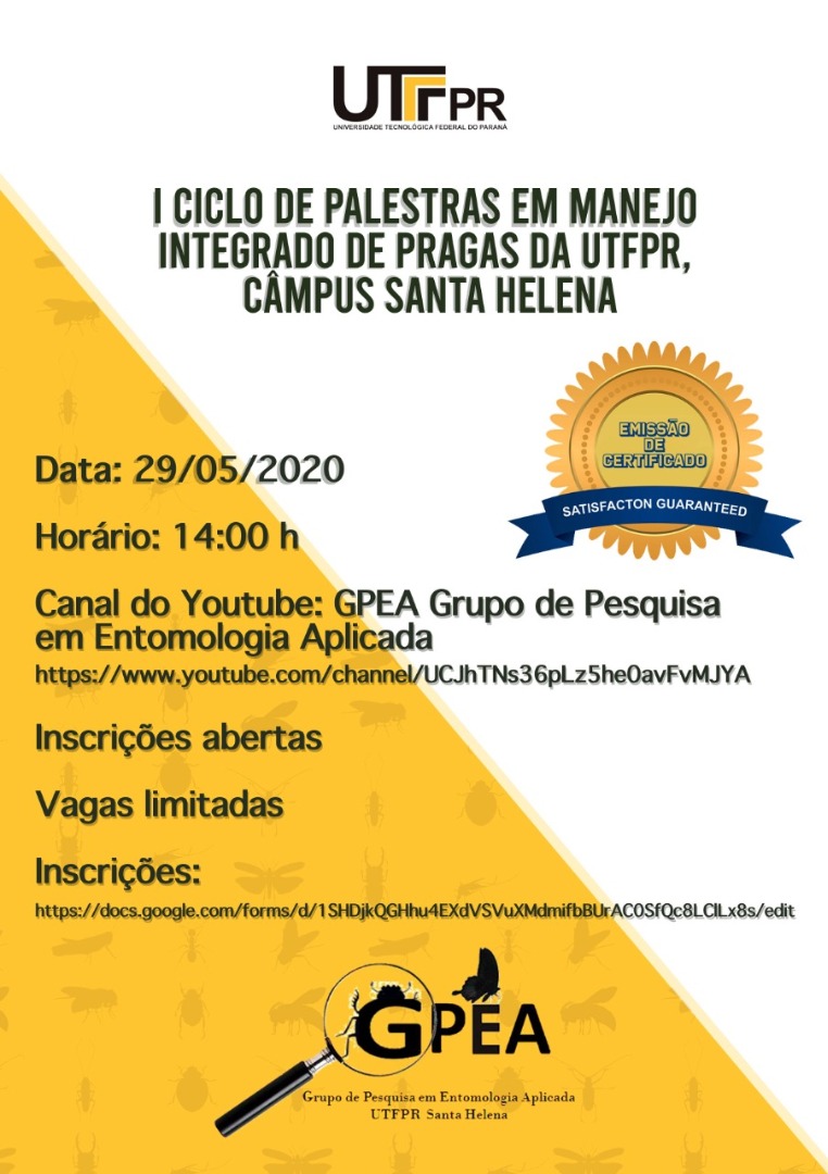 O Grupo de Pesquisa em Entomologia Aplicada (GPEA) convida aos produtores rurais, estudantes de graduação e pós-graduação a participarem do ciclo de palestras online: I Ciclo de Palestras em Manejo Integrado de Pragas da UTFPR, Câmpus Santa Helena . O evento será transmitido pelo canal do GPEA no YouTube: https://www.youtube.com/channel/UCJhTNs36pLz5he0avFvMJYA. O ciclo de palestras ocorrerá no dia 29/05/2020 a partir das 14:00 h. As vagas são limitadas e as inscrições podem ser realizadas pelo link: https://docs.google.com/forms/d/1SHDjkQGHhu4EXdVSVuXMdmifbBUrAC0SfQc8LClLx8s/edit. Os participantes farão jus a declaração de participação.