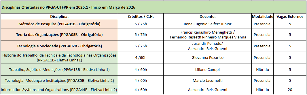 - O formulário tem o objetivo de promover as inscrições para a possível participação da comunidade externa nas disciplinas do Programa de Pós-Graduação em Administração da Universidade Tecnológica Federal do Paraná para o primeiro semestre de 2026.1. Responda o formulário atráves do link (clicando aqui)