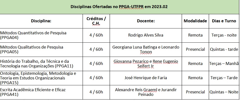 No Segundo Semestre de 2023 o PPGA oferece a possibilidade de participação em disciplinas como alunos externos nas seguintes circunstâncias: