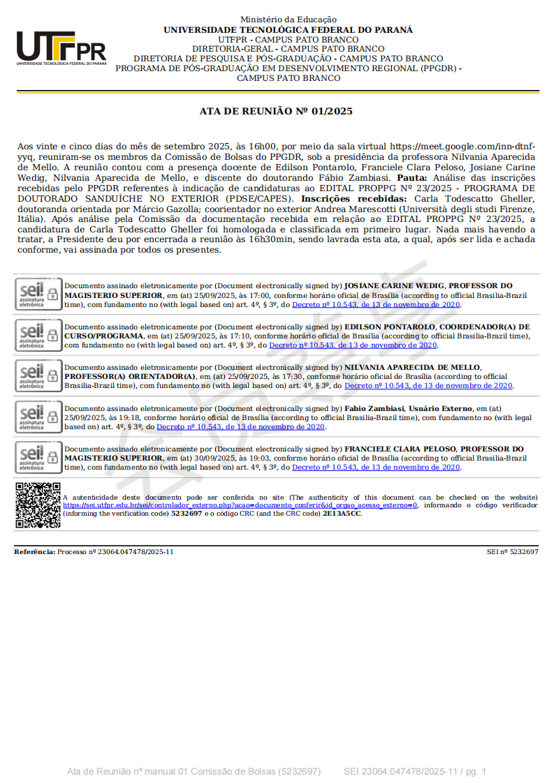 A Comissão de Bolsas do PPGDR reuniu-se em 25/09/2025 para analisar as inscrições recebidas ao EDITAL PROPPG Nº 23/2025 - PROGRAMA DE DOUTORADO SANDUÍCHE NO EXTERIOR (PDSE/CAPES).