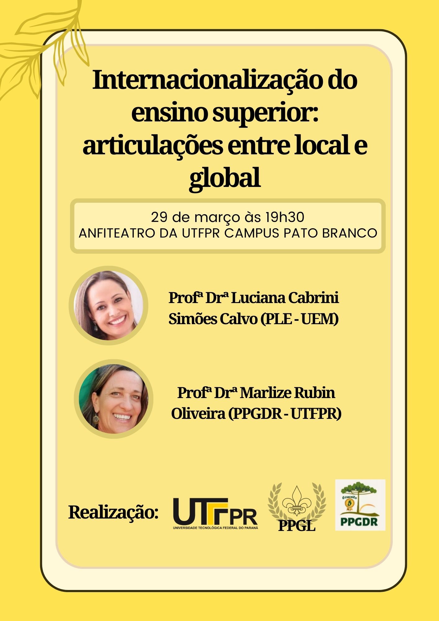 O evento será no dia 29/03, quarta-feira, a partir das 19h30 no Anfiteatro da UTFPR Campus Pato Branco . A participação presencial na atividade confere certificação de 2h. Haverá também transmissão pelo Canal no YouTube do Campus (sem emissão de certificação para participação online) no link https://www.youtube.com/UTFPRcampusPatoBranco