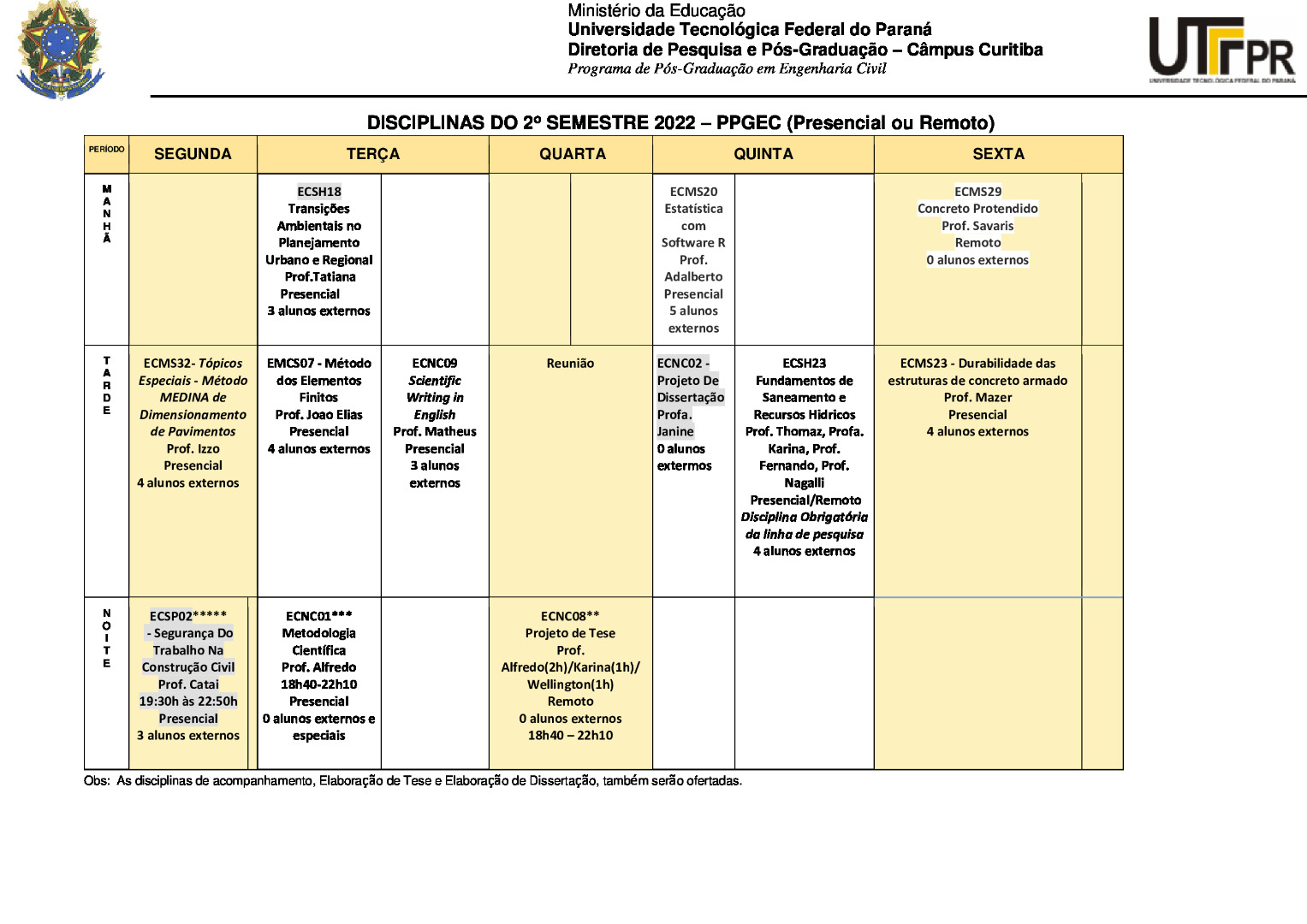 Exceções nos horários: EMCS07 - Método dos Elementos Finitos 14h30min às 17h30min; ECNC08 – Projeto de Tese 18h40min às 22h10min; ECNC01 - Metodologia Científica 18h40min às 22h10min.