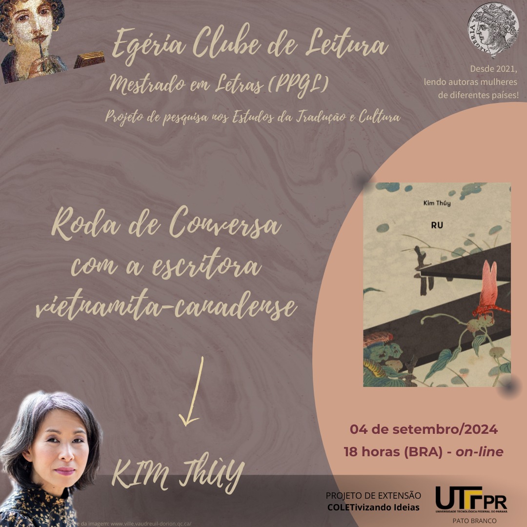 O Clube de Leitura Egéria, projeto de extensão do Curso de Letras, em parceria com o Mestrado em Letras (PPGL) e o Projeto de Pesquisa nos Estados da Tradução e Cultura, promoveu no dia 04 de setembro uma Roda de Conversa com a escritora vietnamita-canadense Kim Thúy. O tema foi o seu livro “Ru”, publicado em 2009 e traduzido para o Brasil em 2022, e o o processo de escrita da autora. Foi um bate-papo com muito conhecimento e muito agradável, pois a autora conversou por quase duas horas com os participantes de uma maneira descontraída, oportunizando a interação a partir das suas histórias de vida. Kim Thúy nasceu no Vietnã, em 1968, e imigrou com a família para o Canadá quando tinha apenas 10 anos de idade. Aos 10 anos, ela deixou o Vietnã, junto com uma onda de refugiados comumente referidos na mídia como "o povo do barco", e se estabeleceu com sua família em Quebec, Canadá, onde reside até hoje. “Ru” é seu livro de estreia e, com ele, recebeu diversos prêmios. Atualmente, já foi traduzido para 29 idiomas e distribuído em 45 países. O evento contou com a participação das professoras Taísa Pinetti Passoni e Cláudia Marchese Winfield e da egressa de Letras Giovanna Bendia que fizeram a tradução para o português da fala da Kim Thúy.