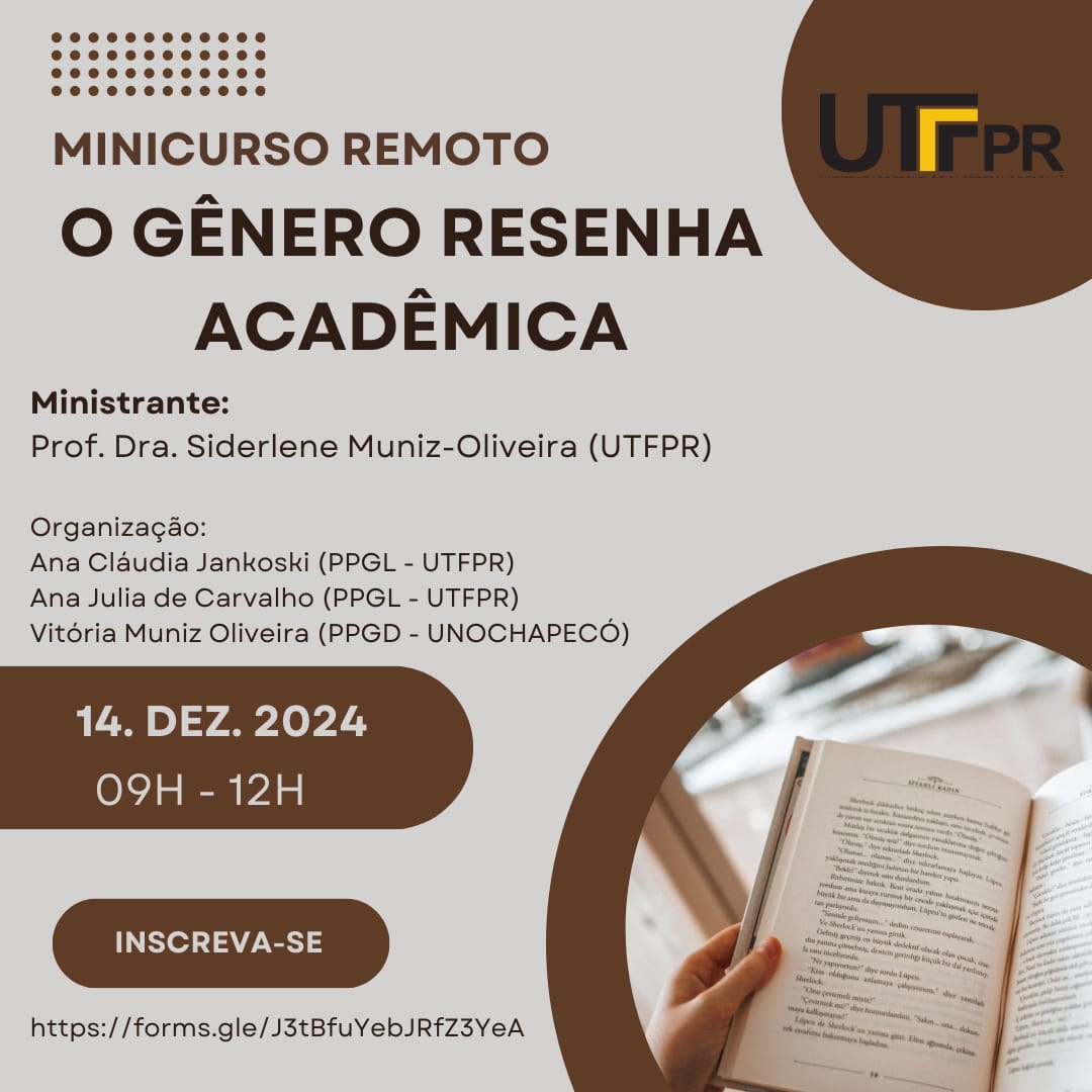 No sábado, 14 de dezembro de 2024, será ofertado o minicurso “Gênero Resenha Acadêmica”, por Siderlene Muniz Oliveira, professora do Programa de Pós-Graduação em Letras da UTFPR, Campus Pato Branco , cujas pesquisas iniciais na vida acadêmica investigou esse gênero. Sua dissertação de mestrado sobre resenha foi publicada em formato de livro intitulado “Resenha e verbos de dizer” (https://riut.utfpr.edu.br/jspui/handle/1/1981) no ano de 2016 pela editora da UTFPR.