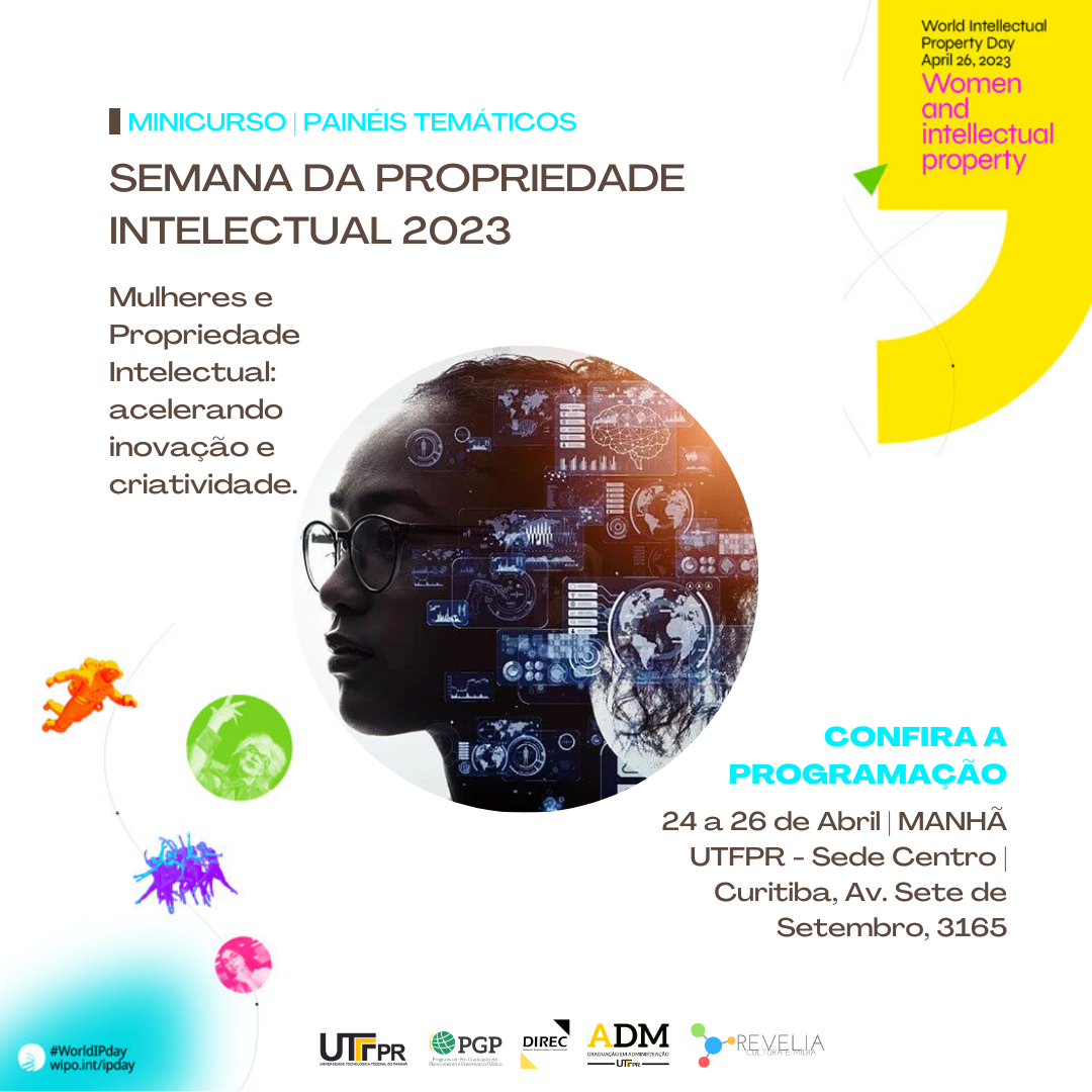 O Programa Pós-Graduação em Planejamento e Governança Pública, em parceria com o Coletivo Revelia Cultura e Mídia, entre os dias 24 e 26 de Abril, promove um evento (aberto ao público) em comemoração ao Dia Da Propriedade Intelectual, cujo tema abordado será Mulheres e Propriedade Intelectual: acelerando inovação e criatividade. No primeiro dia, um minicurso será ministrado; nos dias seguintes painéis temáticos serão apresentados.