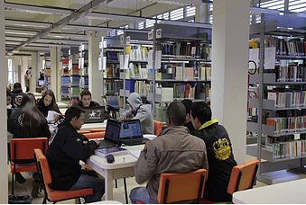 Foto da parte interna da biblioteca - estantes e mesa com alunos