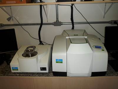 Equipamento de Análise Térmica Simultânea (TG/DSC), com linha de transferência de gases, marca PerkinElmer, modelo “STA 6000” (adquirido com recursos REUNI) Espectrômetro de Infravermelho com transformada de Fourier com acessório de Reflectância Atenuada Total Universal para análise de sólidos e líquidos (UATR) marca PerkinElmer, modelo “FT-IR Spectrum 100S” (adquirido com recursos REUNI)