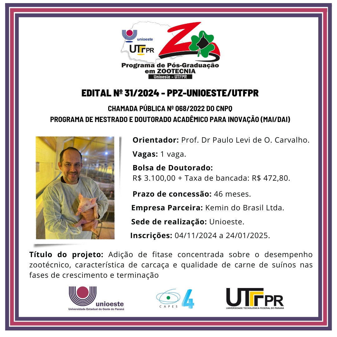 Seleção de candidatos ao Programa de Pós-graduação em Zootecnia para 1 vaga de Doutorado de 2025 - Chamada Pública nº 068/2022 do CNPq – Programa de Mestrado e Doutorado Acadêmico para Inovação (MAI/DAI)