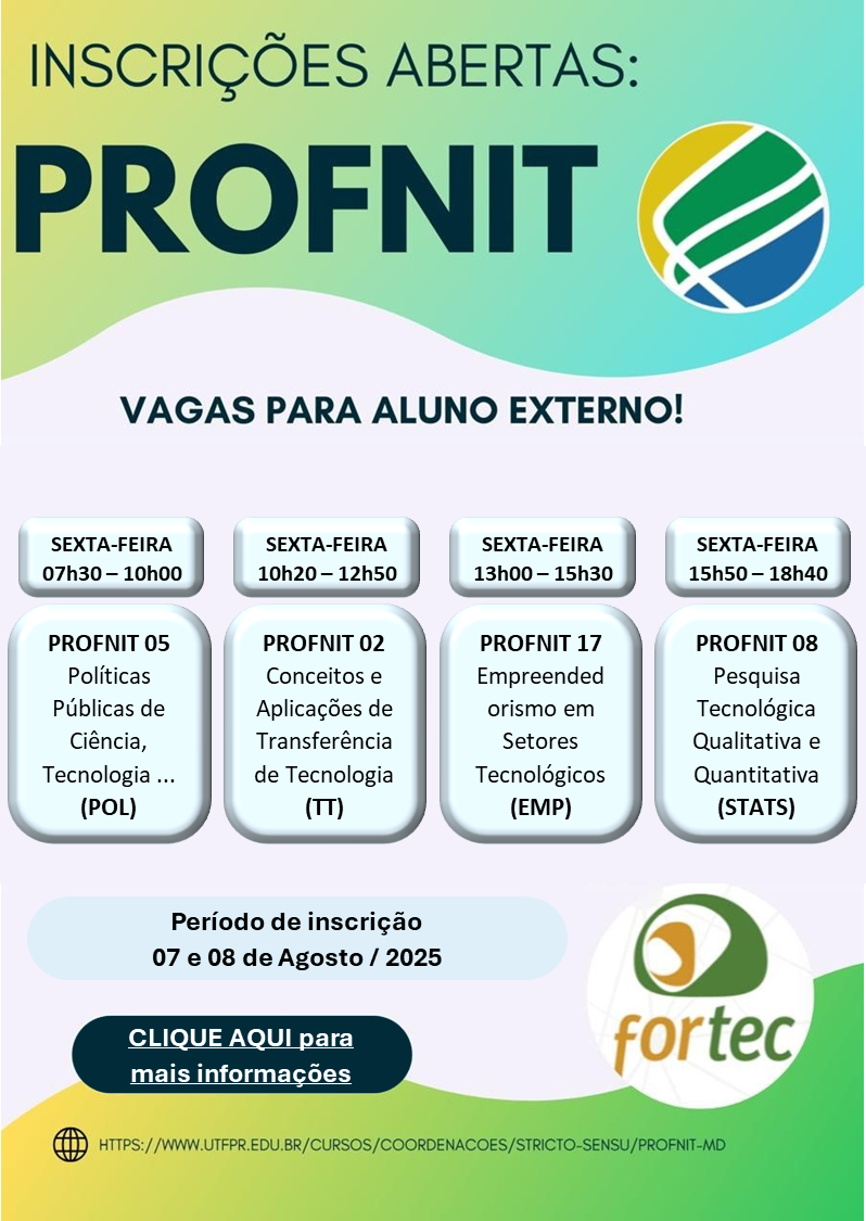 O Programa de Pós-Graduação PROFNIT, Ponto Focal UTFPR - Campus Medianeira , está com inscrições abertas para alunos externos.