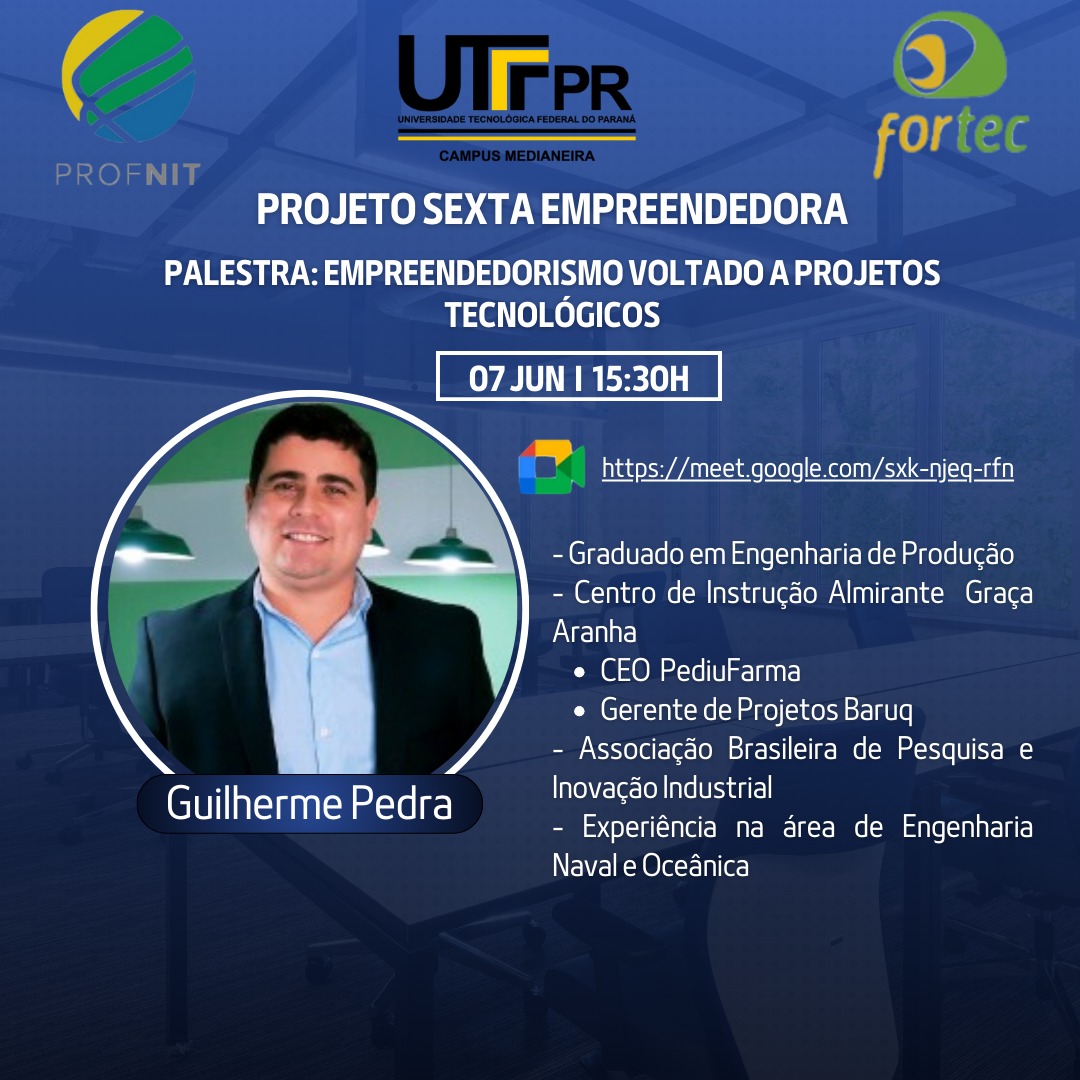 O palestrante será o Sr. Guilherme Pedra, Engenheiro de Produção, CEO da PediuFarma e gerente de projetos Baruq. Também é Membro do Centro de instrução Almirante Graça Aranha e da Associação Brasileira de Pesquisa e Inovação Industrial.