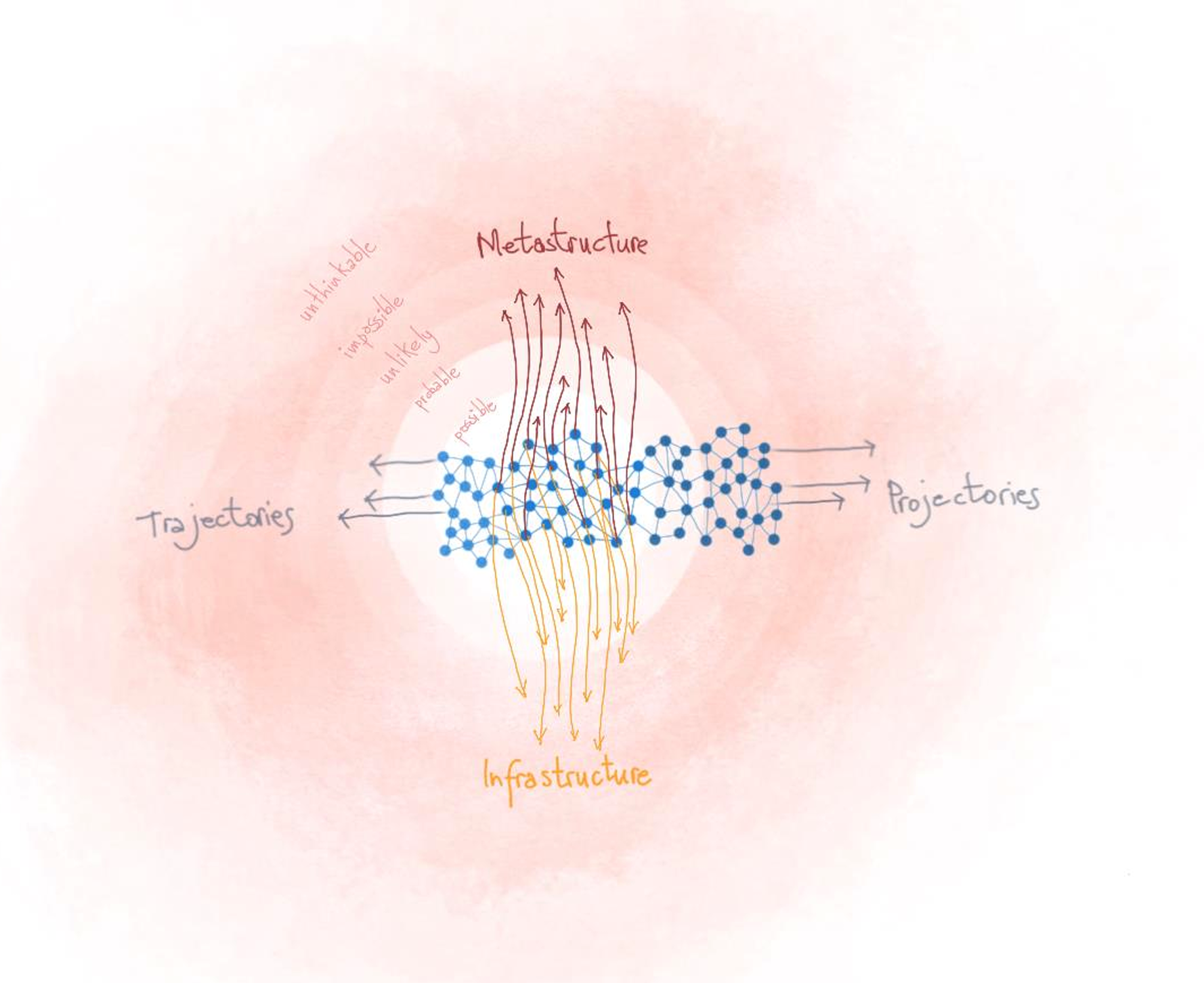 Para projetar transformações, o Design Prospectivo intervém em pontos de alavancagem que formam as linhas de pesquisa do programa: as metaestruturas e as infraestruturas. Compreende-se por metaestruturas os aspectos ideológicos, estéticos, políticos e simbólicos que conferem significado, guiam a conformação e legitimam as estruturas. Já as infraestruturas dizem respeito aos aspectos organizacionais, operacionais, produtivos e instrumentais que dão sustentação e possibilitam a produção das estruturas. No Design Prospectivo, os projetos de transformação estrutural em direção às qualidades relacionais desejadas partem destes dois pólos, envolvendo tanto a prospecção de novas formas de imaginar e dar significado ao mundo por meio das metaestruturas, quanto novas formas de organizar e produzir essas realidades pelas infraestruturas.