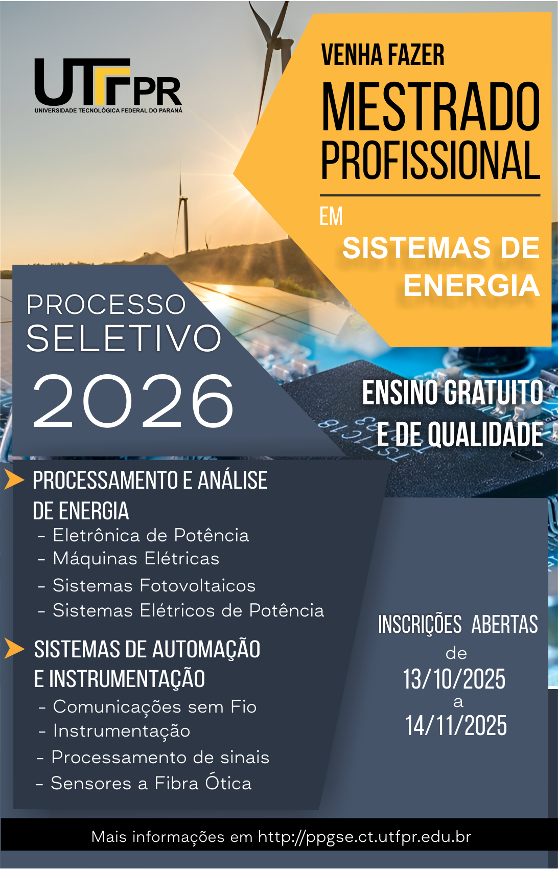 Estarão abertas a partir do próximo dia 13 as inscrições no edital de seleção para o Mestrado Profissional Turma 2026 do PPGSE. O processo visa o preenchimento de até 20 vagas para os(as) interessados(as) em obter o Grau de Mestre(a) em Engenharia Elétrica sendo estas distribuídas nas Linhas de Pesquisa de Processamento e Análise de Energia e de Sistemas de Automação e Instrumentação. As inscrições e o curso são gratuitos se iniciam dia 13 de outubro de 2025 e se encerram dia 14 de novembro de 2025 às 23 h.