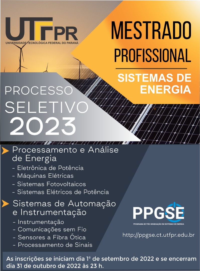 Estão abertas as inscrições no edital de seleção para o Mestrado Profissional Turma 2023 do PPGSE. O processo visa o aprovisionamento para o preenchimento das vagas para os interessados em obter o Grau de Mestre em Engenharia Elétrica sendo estas distribuídas nas Linhas de Pesquisa de Processamento e Análise de Energia e de Sistemas de Automação e Instrumentação de acordo com a demanda e disponibilidade dos professores orientadores. As inscrições e o curso são gratuitos se iniciam dia 1º de setembro de 2022 e se encerram dia 31 de outubro de 2022 às 23 h.