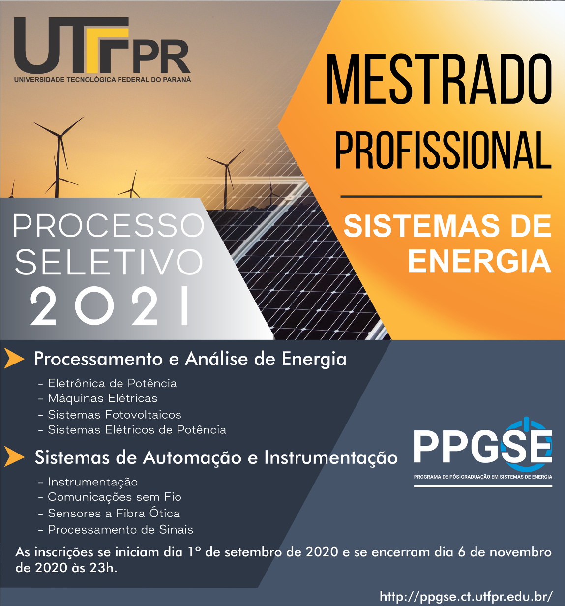 Foi publicado o edital de seleção para a turma 2021 do PPGSE. O processo visa ao preenchimento de até 16 vagas para os interessados em obter o Grau de Mestre em Engenharia Elétrica sendo estas distribuídas nas áreas de Processamento e Análise de Energia e Sistemas de Automação e Instrumentação de acordo com a demanda e disponibilidade dos professores orientadores. As inscrições e o curso são gratuitos se iniciam dia 1º de setembro de 2020 e se encerram dia 6 de novembro de 2020 às 23h.