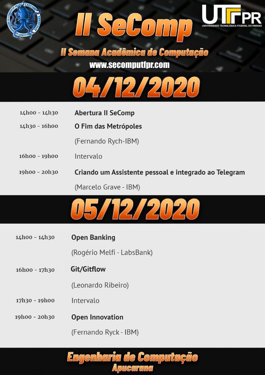 O evento é gratuito e aberto à comunidade (interna e externa a UTFPR) e ocorrerá nos dias 04 e 05 de dezembro de 2020.