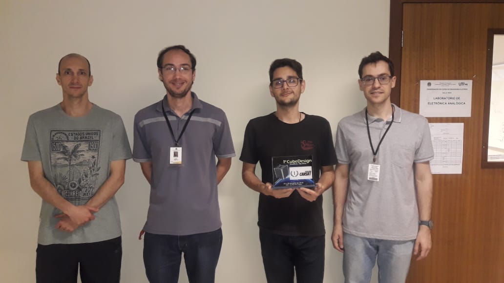 A equipe ArapucaSat formada pelos professores Fernando Barreto e Lucio Agostinho Rocha, de Engenharia de Computação; Thales Eugênio Portes de Almeida, de Engenharia Elétrica; e pelo aluno João Carlos Soto Riva, de Engeharia Têxtil conquistaram um troféu em reconhecimento à atuação no 1º CubeDesign, evento ocorrido entre