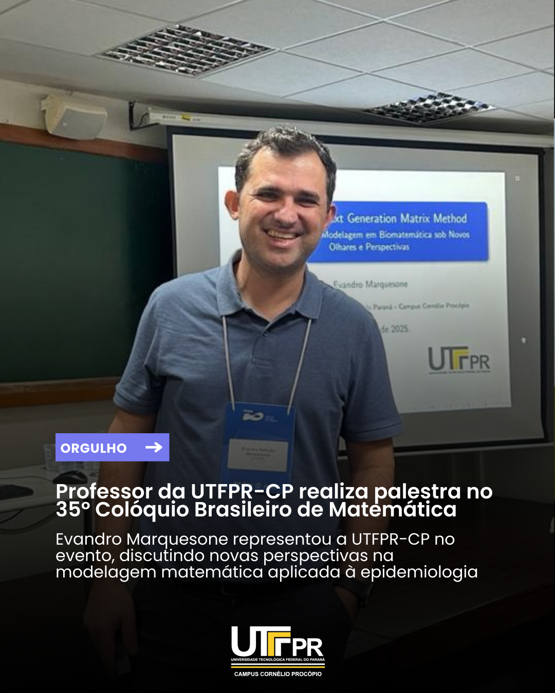 A UTFPR-CP parabeniza o Prof. Dr. Evandro Estevão Marquesone pela relevante contribuição científica e pela representatividade do campus no 35º Colóquio Brasileiro de Matemática. Sua atuação reforça o compromisso da instituição com a pesquisa, a extensão e a divulgação científica, promovendo a integração entre a comunidade acadêmica e a sociedade.