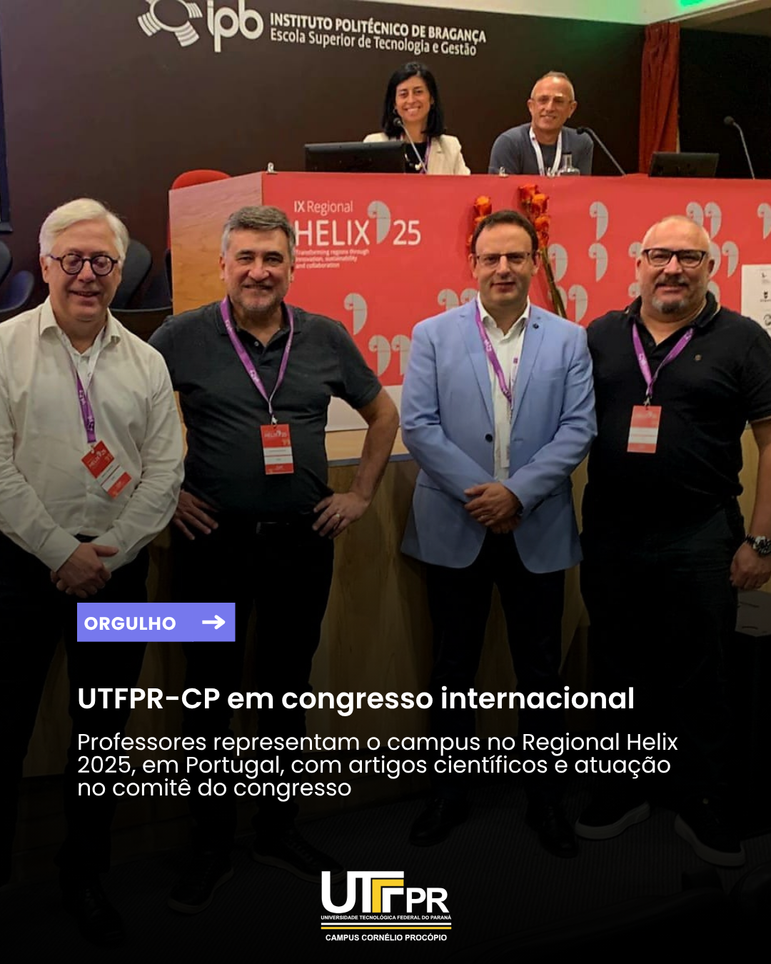A UTFPR-CP parabeniza os professores Luiz César de Oliveira, Márcio Jacometti e Luciano Tadeu Pansanato pelo destaque no IX Regional Helix 2025. A atuação dos docentes no evento não apenas reforça a excelência da nossa comunidade acadêmica, mas também amplia as fronteiras da universidade, levando o nome da UTFPR e da cidade de Cornélio Procópio para o mundo. Seguimos com orgulho e entusiasmo na missão de promover o conhecimento, a inovação e o desenvolvimento regional com reconhecimento internacional.