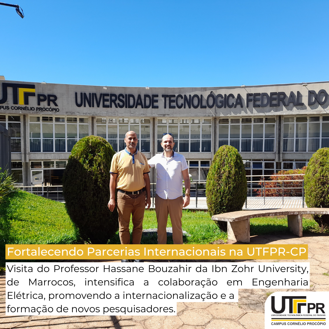 A visita do Professor Bouzahir ao campus de Cornélio Procópio é resultado de uma colaboração contínua com o Professor Doutor Alessandro do Nascimento Vargas, docente permanente do Programa de Pós-Graduação em Engenharia Elétrica (PPGEE) e do Programa de Pós-Graduação em Automação e Engenharia Elétrica (PPGAEE) da UTFPR-CP. Esse encontro reforça os laços entre os grupos de pesquisa envolvidos e busca ampliar as frentes de pesquisa e cooperação internacional entre os dois países, com foco no avanço da qualidade das pesquisas na área de Engenharia Elétrica.