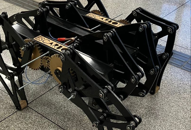 Dois alunos de Engenharia Mecatrônica do Campus Curitiba da UTFPR desenvolveram um sistema de locomoção alternativo para dispositivos exploratórios e para cadeiras de rodas motorizadas, otimizado para terrenos irregulares, como areia, por exemplo. Luryam Ferreira Barreto Miranda e Willian Teixeira Bond aceitaram o desafio proposto pelo orientador, professor Luiz Carlos de Abreu Rodrigues, do Departamento Acadêmico de Mecânica (DAMEC), e criaram o robô Escarbots, um protótipo em tamanho real inspirado no mecanismo de Theo Jansen, um sistema de ligações que permite a um conjunto de peças se mover de forma semelhante aos animais.