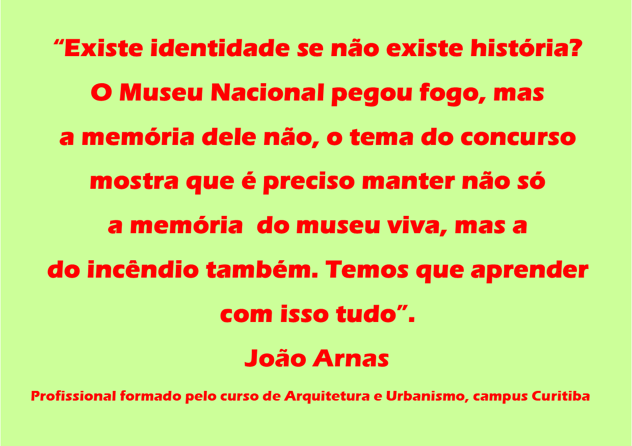 Sobre concurso, a professora Karina Pimentel explica que “é um dos mais importantes na área de Arquitetura do Brasil. Todas as pessoas envolvidas nesse universo conhecem e a participação é maciça”; Pimentel, uma das incentivadoras dos alunos, celebra a vitória dos seus orientandos como expoentes no circuito nacional. Arnas destaca o tema, que os estimulou ao investimento: “O edifício do Museu Nacional era e abrigava parte da nossa identidade coletiva, cultural, nossa história. Existe identidade se não existe história? O Museu Nacional pegou fogo mas a memória dele não, o tema do concurso mostra que é preciso manter não só a memória do museu viva, mas a do incêndio também. Temos que aprender com isso tudo”.