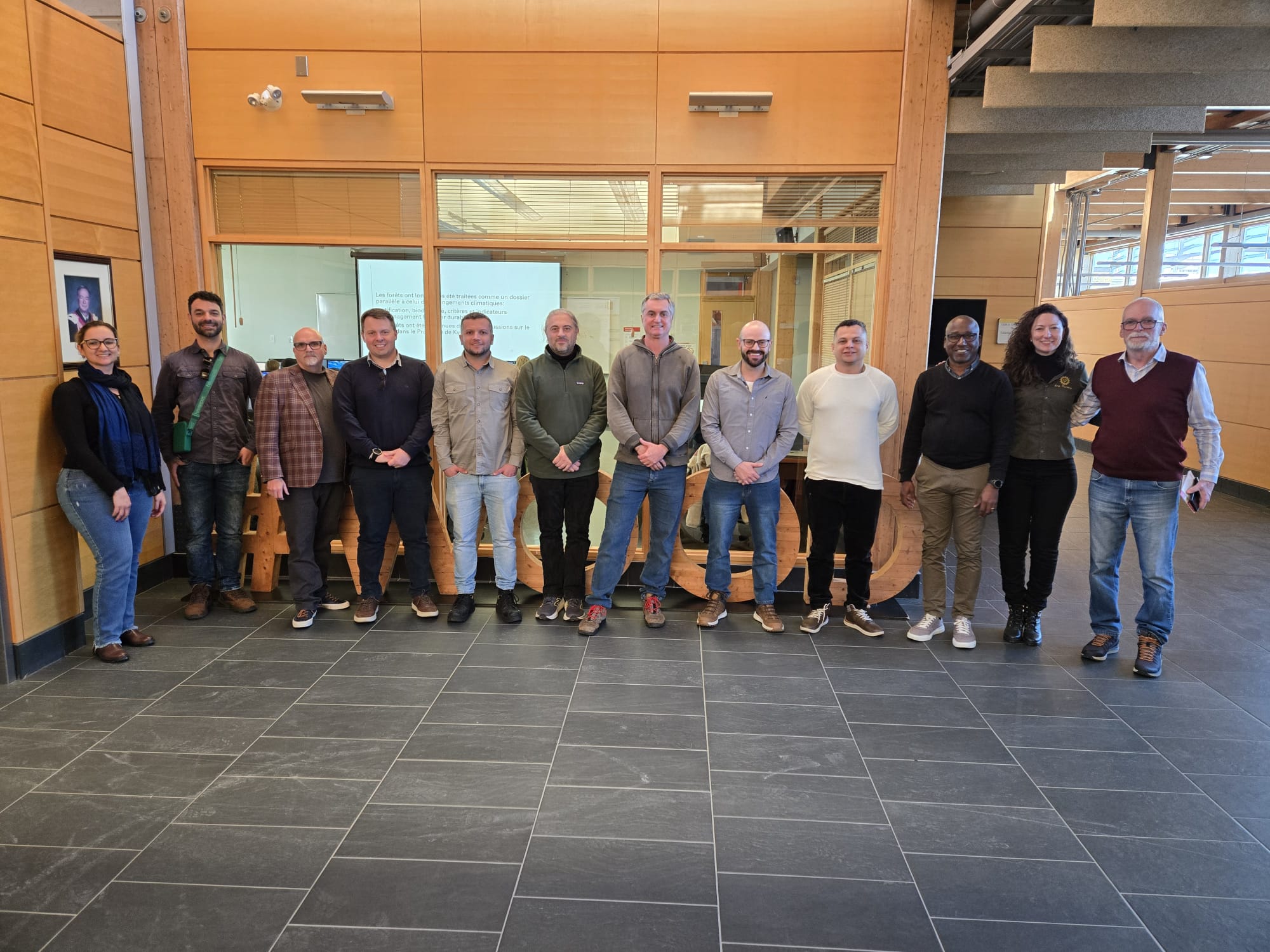 A missão também incluiu visitas a instituições de pesquisa no Canadá. A equipe da UTFPR conheceu os laboratórios da École de Technologie Supérieure (ÉTS), uma universidade pública referência na formação e investigação em engenharia aplicada e tecnologia, e da FPInnovations, uma organização sem fins lucrativos voltada para resolver desafios do setor florestal canadense e aumentar sua competitividade no mercado global. O grupo também esteve no Centre de Recherche sur les Matériaux Renouvelables (CRMR) e na Chaire Industrielle de Recherche sur la Construction Écoresponsable en Bois (CIRCERB), ambos da Université Laval, onde assistiram a uma apresentação do Doutor Pierre Blanchet, especialista em materiais de construção à base de madeira.