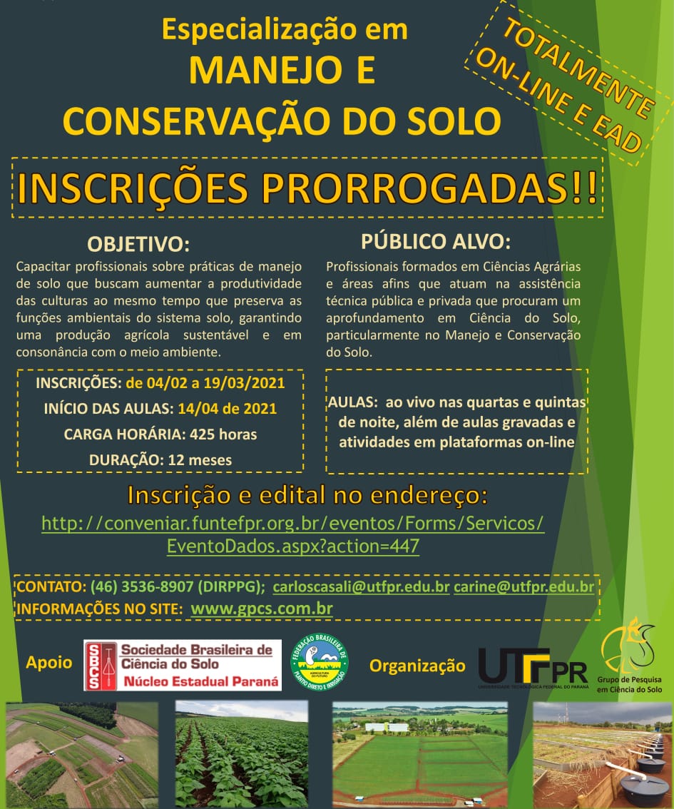 Essa é a última semana que os profissionais das ciências agrárias têm para se inscrever no curso de Especialização em Manejo e Conservação do Solo. Elas estão abertas até sexta feira, 19/03 e sem previsão de prorrogação.