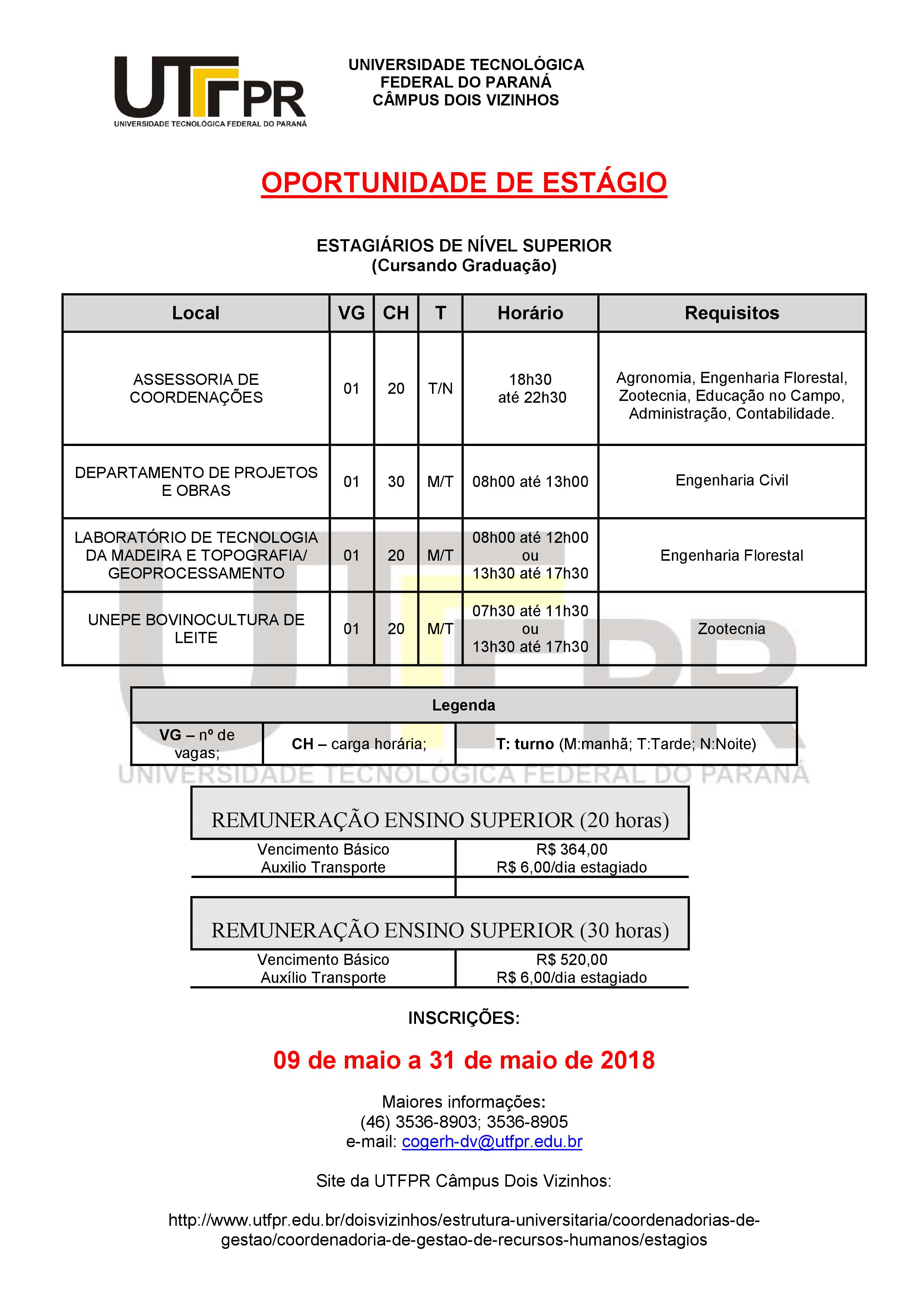 Até o dia 31 de maio de 2018, estarão abertas as inscrições para o provimento de vagas de estágios nos seguintes locais/coordenações no câmpus Dois Vizinhos :