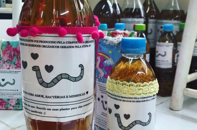 Para que a comunidade possa ser beneficiada com o biofertilizante gerado, os participantes do projeto customizam caixinhas de leite e garrafas pet. Elas servirão de recipientes para armazenar o produto e carregadas para casa. Além disso, podem ser reutilizadas para serem reabastecidas com novo biofertilizante.