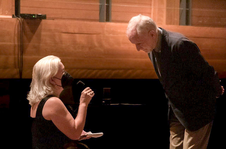 Giceli Portela, da UTFPR, e o arquiteto francês Benjamin Mouton na Capela Santa Maria, em Curitiba (Foto: Divulgação)