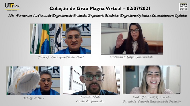 Na tarde desta sexta-feira (02), a UTFPR campus Londrina , realizou duas Solenidades de Colação de Grau Magna Virtuais. A primeira foi realizada às 15h, com os cursos de Engenharia Ambiental, Engenharia de Materiais e Tecnologia em Alimentos, e a segunda, às 18h, com os cursos de Engenharia de Produção, Engenharia Mecânica, Engenharia Química e Licenciatura em Química.