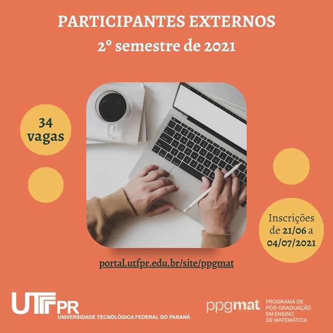 Estão abertas as inscrições para a seleção de participantes externos, para o segundo semestre, no Programa de Pós-Graduação em Ensino de Matemática (PPGMAT), Campus Cornélio Procópio / Londrina , da UTFPR. Todas as disciplinas serão ofertadas integralmente de forma remota, a partir do dia 05 de agosto de 2021.