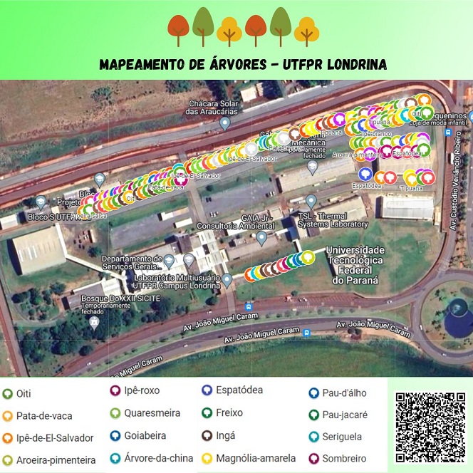 A acadêmica Elora Eduarda Camilo de Souza, do curso de Engenharia Ambiental e Sanitária, da UTFPR campus Londrina , acaba de concluir o mapeamento das árvores plantadas na área interna do Campus Londrina . O projeto “Por que conhecer as árvores do campus?”, orientado pelas professoras Patrícia Carneiro Lobo Faria e Lígia Antunes Batista, que foi proposto em um edital de Protagonismo Estudantil, viabilizou o registro de informações sobre as árvores presentes no interior do Campus, tais como: nome comum, tamanho, necessidade de poda e o mapeamento da posição de cada uma.
