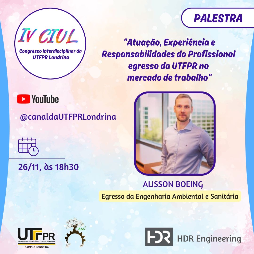 No dia 26 de novembro, próxima terça-feira, às 18h30, como parte da programação do IV Congresso Interdisciplinar da UTFPR Londrina (CIUL), será proferida a palestra "Atuação, Experiência e Responsabilidades do Profissional Egresso da UTFPR no mercado de trabalho", com o egresso Alisson Boeing, do curso de Engenharia Ambiental, que atua com o gerenciamento de projetos de construção de estação de tratamento de esgoto e administração de projetos relacionados à qualidade da água para Las Vegas Valley, na empresa HDR Engineering.