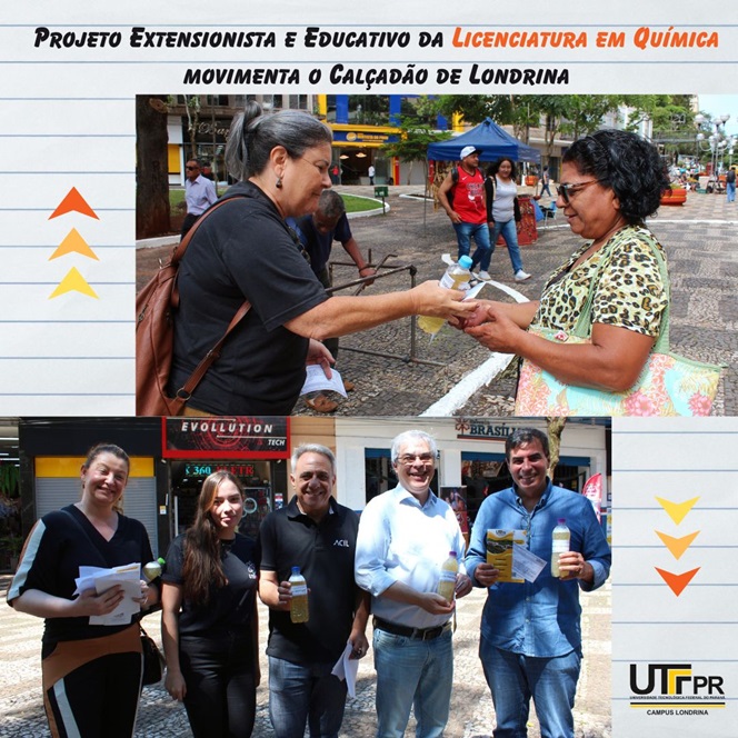 O Projeto de Ações Educativas para Reciclagem de Óleo e Gorduras para Produção de Sabão Caseiro líquido movimentou o Calçadão da cidade de Londrina , pela manhã, no último sábado (09/12). A ação de extensão do curso de Licenciatura em Química, coordenada pelos professores Isabel Craveiro Moreira Andrei, Alessandra Stevanato e Cristiano Torres Miranda, que contou com a participação de seis alunos(as) do curso, distribuiu a comunidade londrinense 140 litros de sabão líquido com a receita.